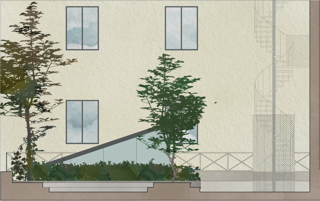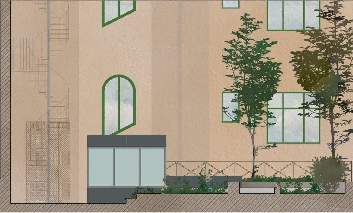 Som ett led i fastighetsutvecklingen av N55 på Östermalm formgav och projekterade BRUXX inredningen till de publika delarna av projektet. Det innefattade bland annat utvändig entré, lobby för hyresgästerna och deras besökare, hissinredning och omklädningsrum med duschar i källaren. I projektet ingick även formgivning av innergården där den gamla markstenen återbrukades för att skapa nya ytor att vistas på. Gården kompletterades med nya gångstråk och har även försetts med sittmöbler och nya växter.